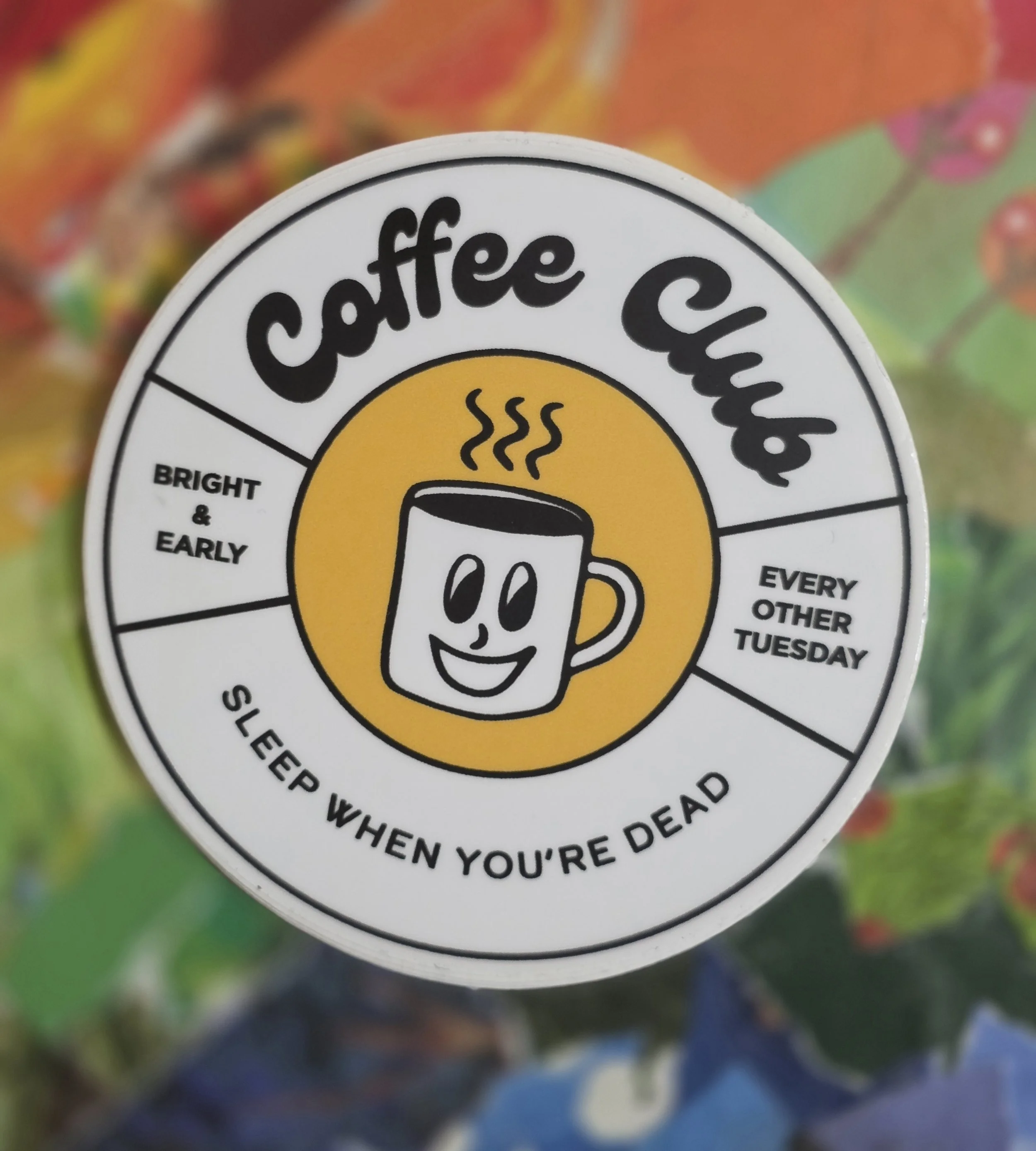 From Charmellow- 3-inch high-quality vinyl sticker featuring a super happy little coffee cub dude. This sticker is a tribute to a real coffee club that meets on Tuesdays. yours doesn't have to meet on Tuesdays, you do you.